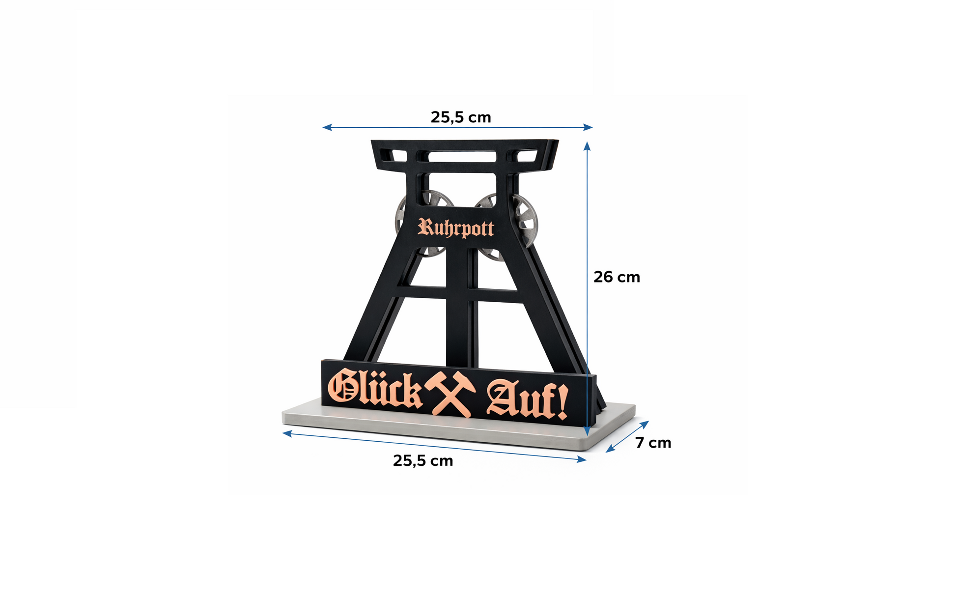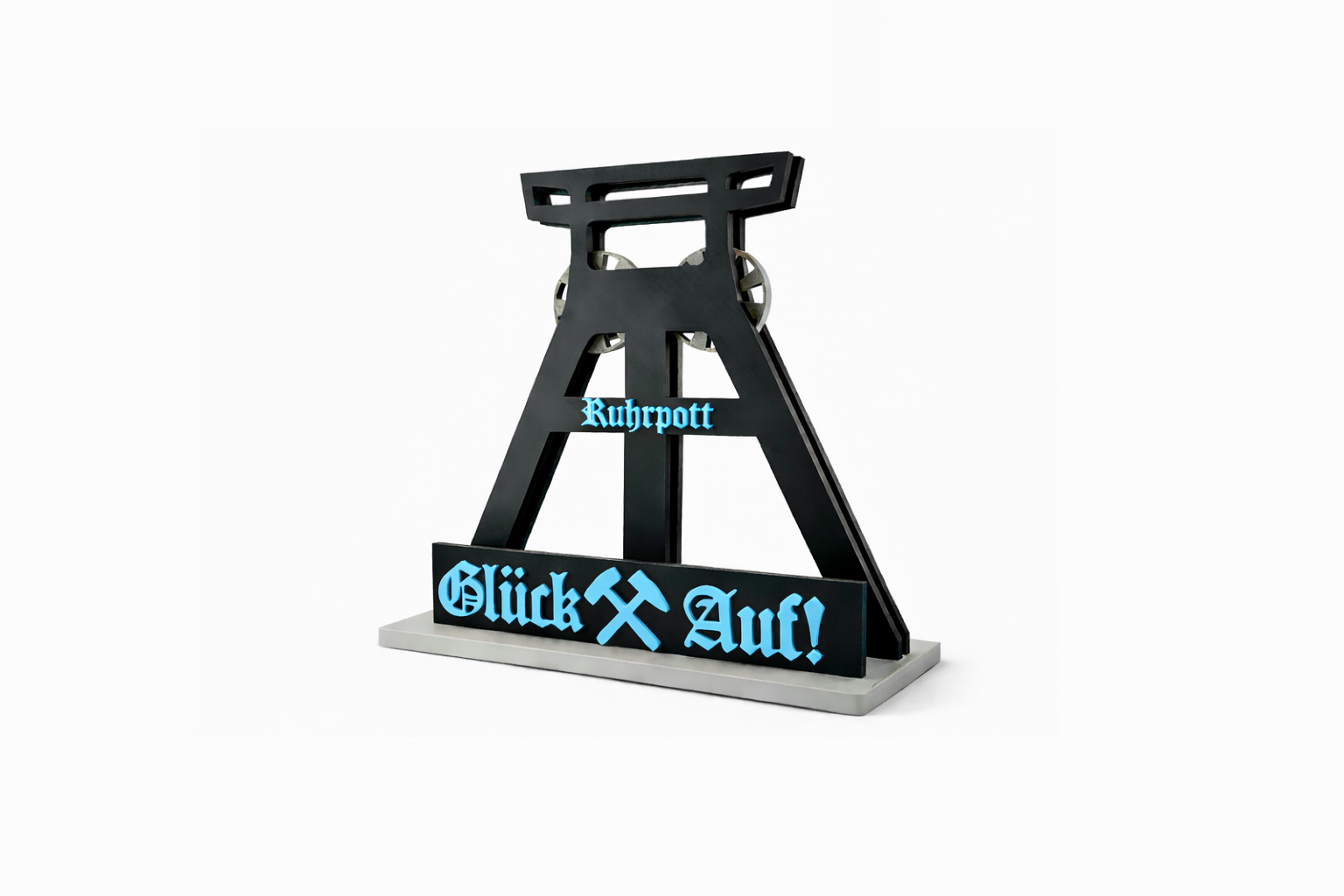 Dieser detailreiche Förderturm bringt echte Ruhrpott Atmosphäre in dein Zuhause. Inspiriert von historischen Zechenanlagen steht er für Tradition, Zusammenhalt und Stolz. Die markante Silhouette wird durch deinen individuell wählbaren Schriftzug zu einem ganz persönlichen Blickfang auf Regal, Schreibtisch oder Sideboard.