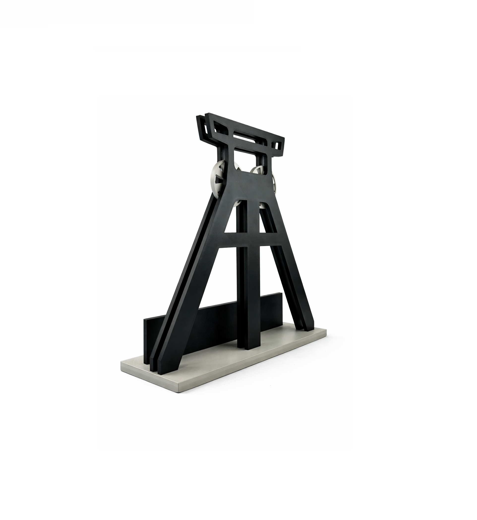 Ein besonderes Detail sind die integrierten Förderräder am Turmkopf. Diese sind beweglich gelagert und lassen sich drehen, was dem Modell zusätzliche Authentizität und einen technischen Charakter verleiht. Dadurch wirkt der Förderturm noch näher am historischen Original und hebt sich deutlich von rein statischen Dekoobjekten ab.